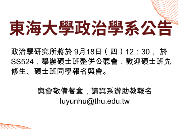 東海政治系是臺灣最早成立的政治系之一,培養人才無數、學術底蘊深厚。除了東海大學與姊妹校的合作關係外,政治系也和許多國內外知名學術機構成為伙伴,發展聯合授課、講座、雙聯學位等項目。目前,系上不但聘請曾獲兩次政治學傑出獎的〈中研院人社中心〉曾國祥研究員至系上授課,亦與美國聖湯瑪斯大學(University of St. Thomas)簽署碩士雙聯學位,未來,我們還要和臺灣、歐美的學術單位及智庫發展「識讀中國」等合作方案,讓政治系的視野更廣。