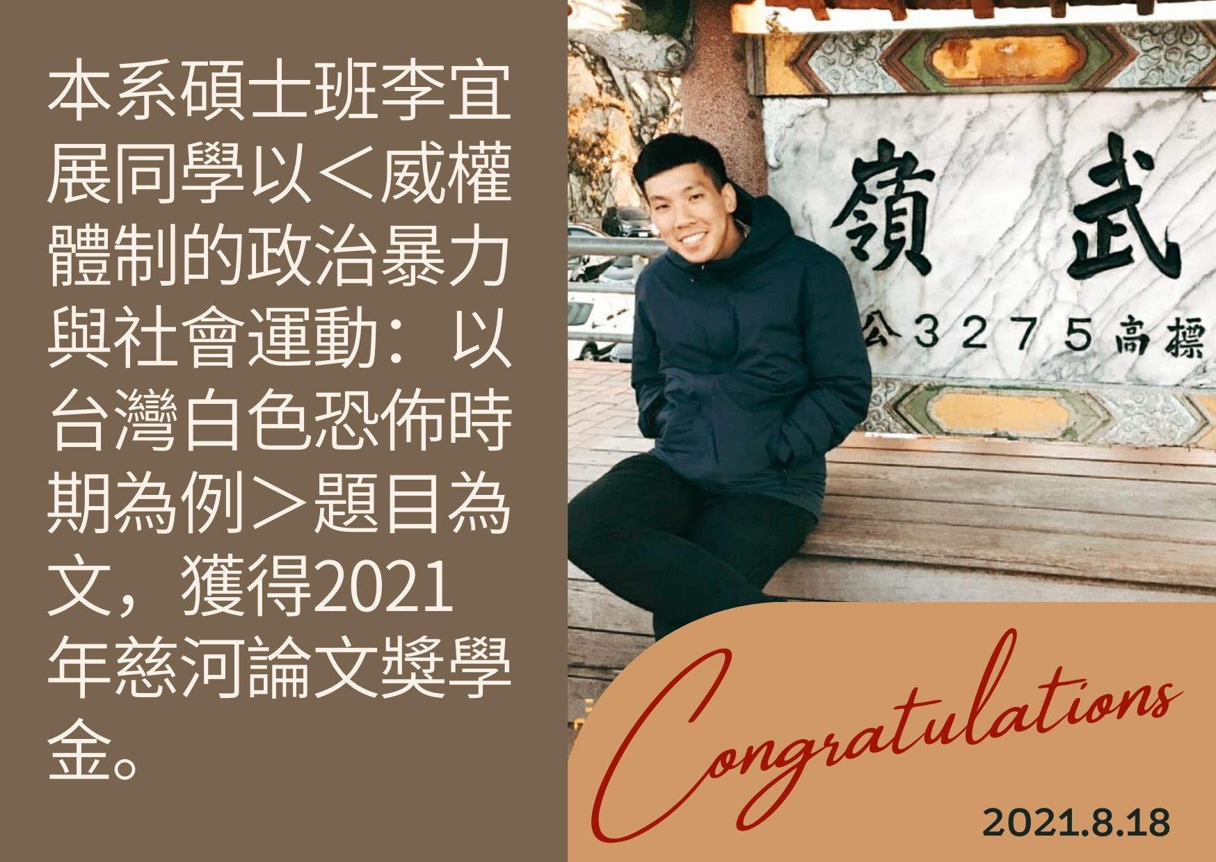 賀:本系碩士班李宜展同學以<威權體制的政治暴力與社會運動:以台灣白色恐佈時期為例>題目為文,獲得2021年慈河論文獎學金。