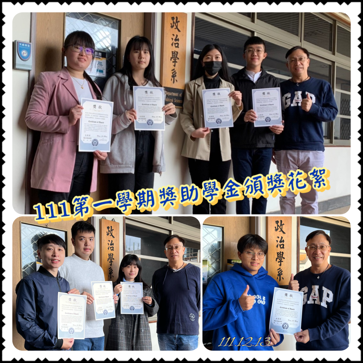 本系111學年度第一學期李傅婘英紀念獎學金獲獎人林沂臻同學、林宗光先生紀念獎學金獲獎人吳函凌同學、余家文同學,傅恒德教授研究創新獎學金獲獎人楊宗曄同學、羅翊廷同學,與勵學獎助學金獲獎人洪瑜君同學、戴志穎同學、許家祥同學,八位同學在系辦公室前,由主任王啟明老師正式授予獎狀並拍照留念。