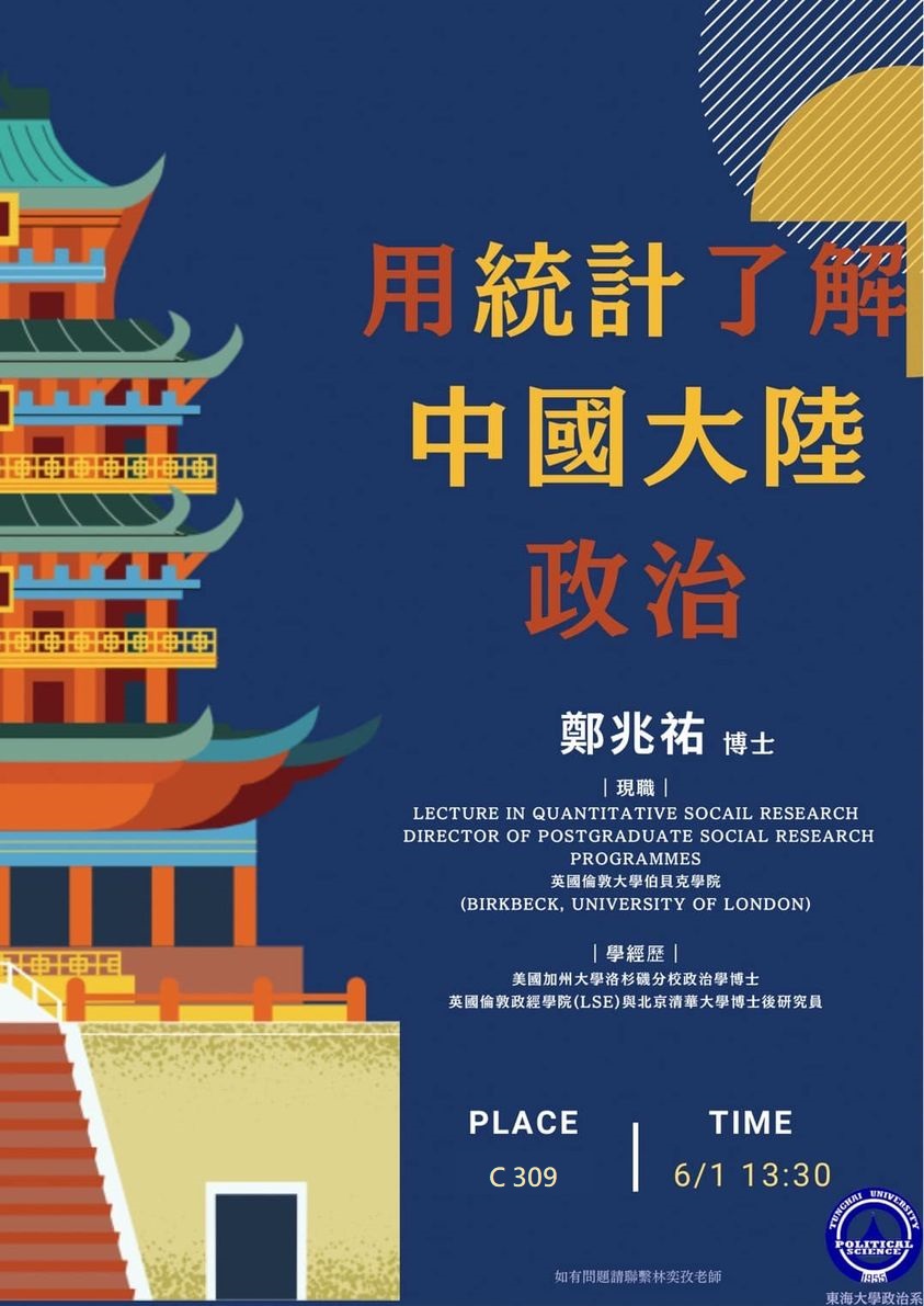用統計了解中國大陸政治 — 鄭兆祐老師現為英國倫敦大學伯貝克學院Quantitative Social Research 的講師(助理教授)。鄭老師於美國加州大學洛杉磯分校取得政治學博士學位,曾任英國倫敦政經學院與北京清華大學博士後研究員。